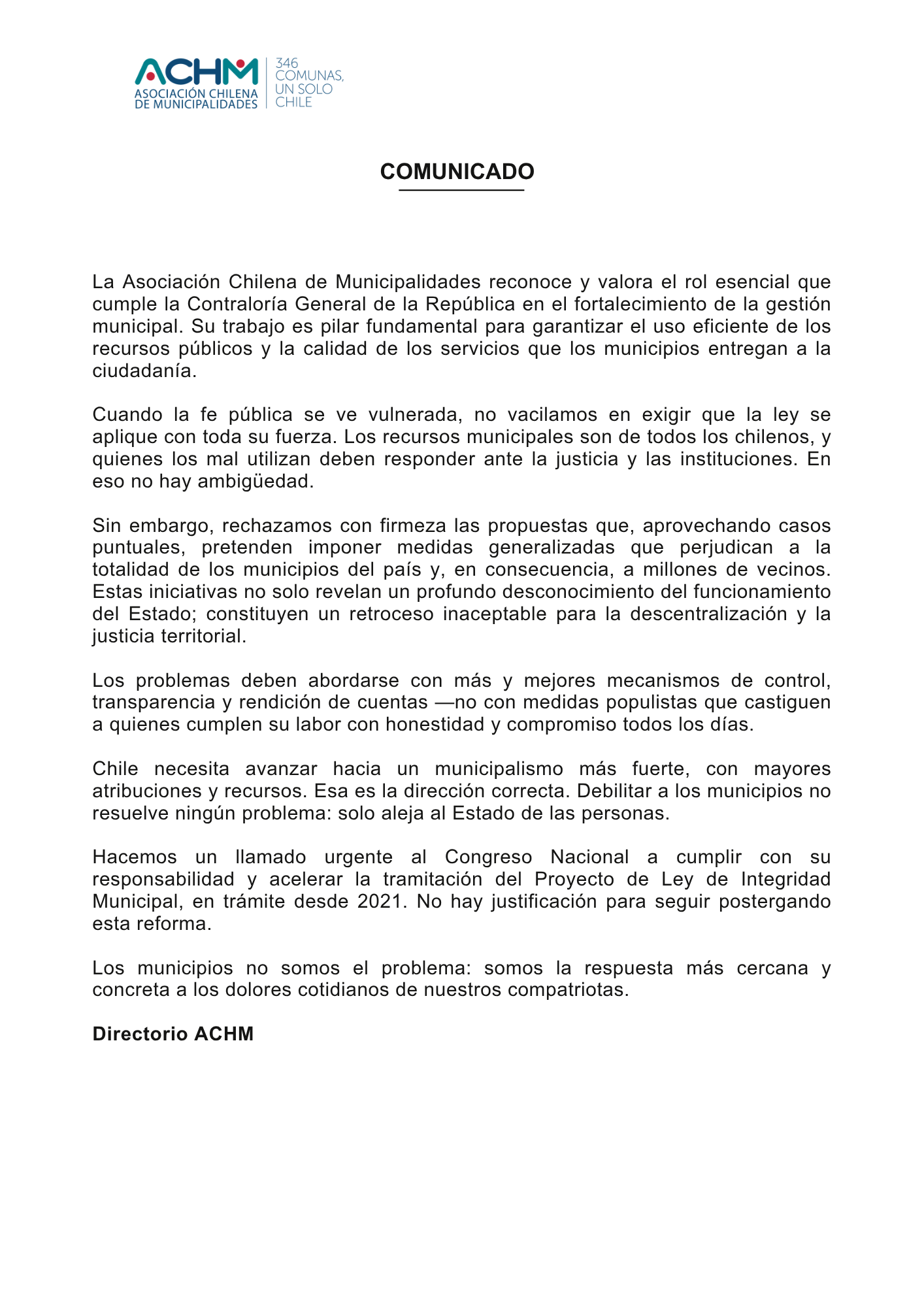 El directorio de la ACHM se pronuncia respecto a lo señalado por la Contraloría, relevando el uso responsable de los recursos municipales, la transparencia y el impacto en las comunidades.