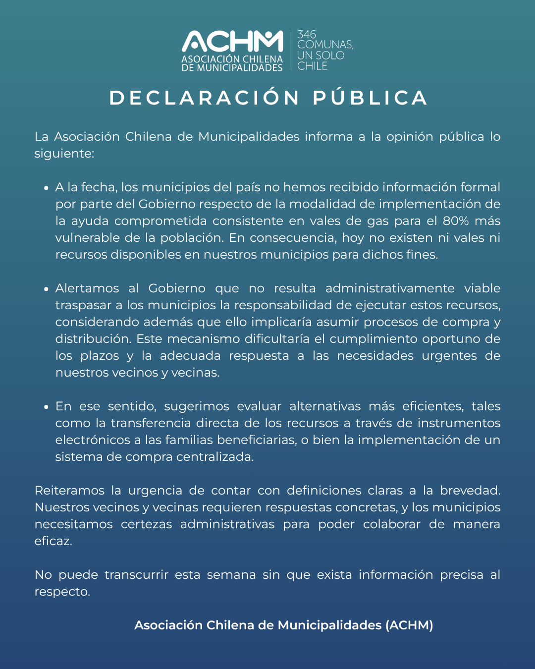 La Asociación Chilena de Municipalidades informa a la opinión pública lo siguiente: